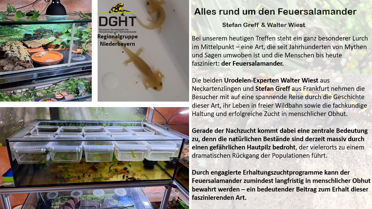 Die beiden Urodelen-Experten Walter Wiest aus Neckartenzlingen und Stefan Greff aus Frankfurt nehmen die Besucher mit auf eine spannende Reise durch die Geschichte dieser Art, ihr Leben in freier Wildbahn sowie die fachkundige Haltung und erfolgreiche Zucht in menschlicher Obhut.